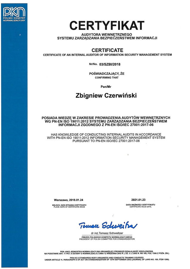 - Certyfikat Audytora Wewnętrznego Systemu Zarządzania Bezpieczeństwem Informacji wydany przez Polski Komitet Normalizacyjny w Warszawie