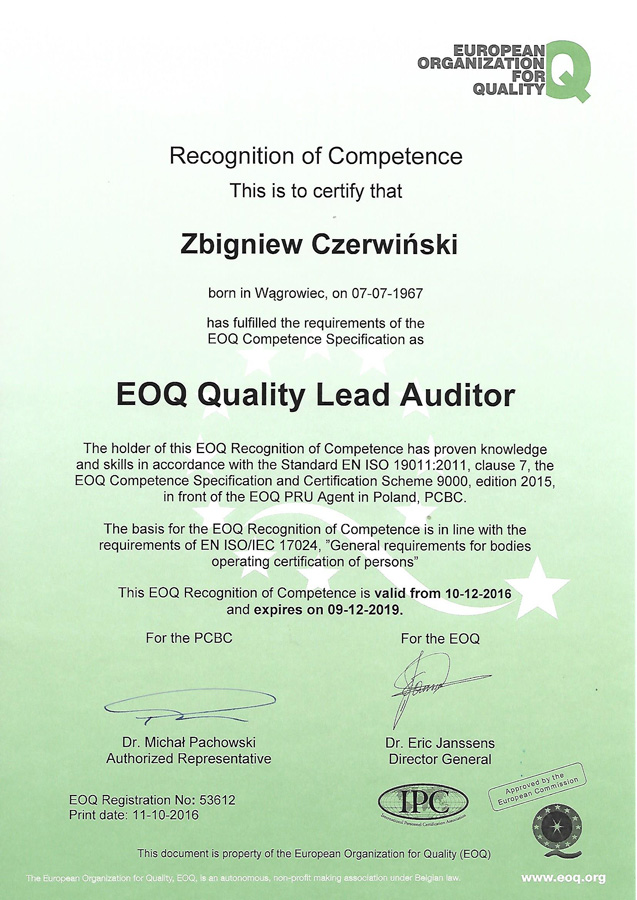 - Certyfikat EOQ Quality Lead Auditor wydany przez European Organization for Quality z siedzibą w Brukseli