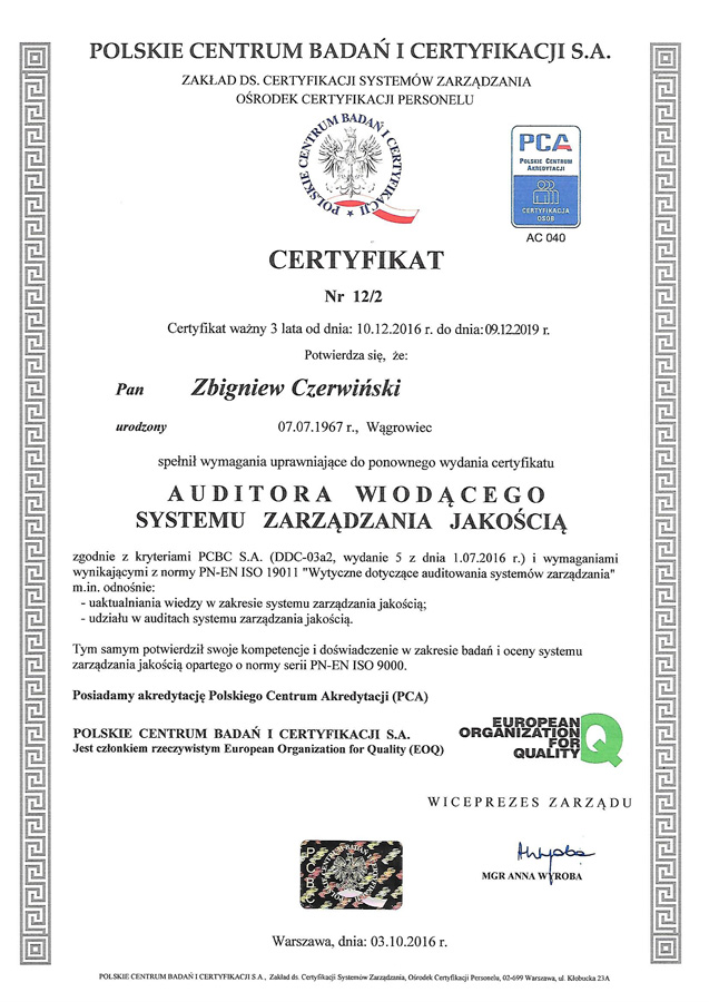 - Certyfikat Audytora Wiodącego systemu zarządzania jakością wydany przez Polskie Centrum Badań i Certyfikacji w Warszawie