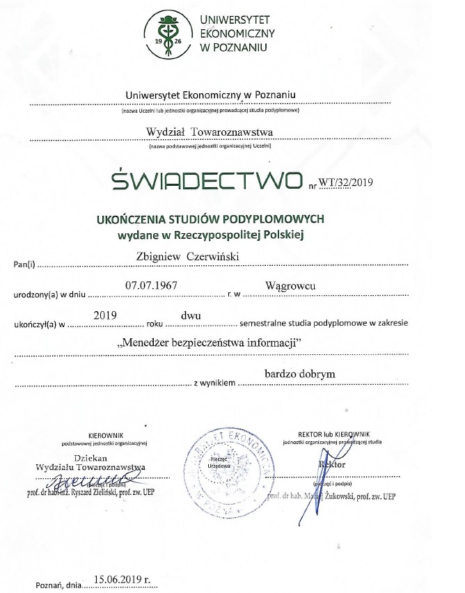- Dyplom Menadżera Bezpieczeństwa Informacji wydany przez Uniwersytet Ekonomiczny w Poznaniu